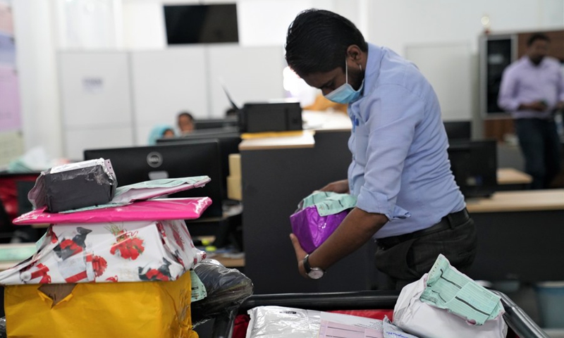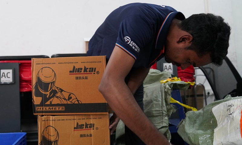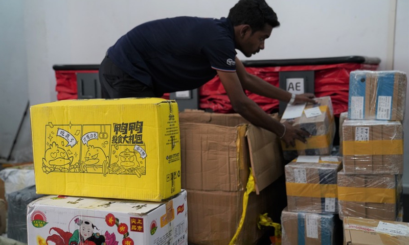 An employee sorts goods received from China before the Spring Festival at a local cross-border transshipment company in Colombo, Sri Lanka. (Xinhua/Tang Lu)
