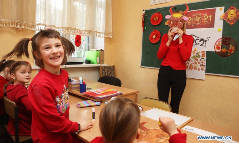 Students interact with a teacher during a craft class at Kiev Gymnasium of Oriental Languages No. 1 in Kiev, Ukraine, Feb. 15, 2021. In celebration of the Chinese lunar new year, the school held activities to help students learn about Chinese culture. (Photo by Sergey Starostenko/Xinhua)