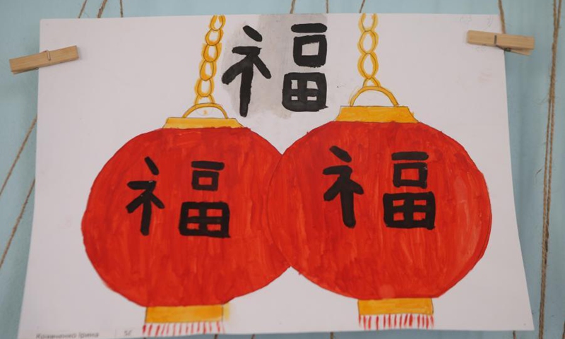 A drawing on Chinese lunar new year is displayed at Kiev Gymnasium of Oriental Languages No. 1 in Kiev, Ukraine, Feb. 15, 2021. In celebration of the Chinese lunar new year, the school held activities to help students learn about Chinese culture. (Photo by Sergey Starostenko/Xinhua)