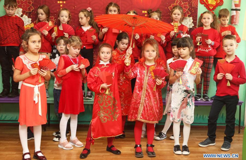 Students in traditional Chinese costumes pose for a photo at Kiev Gymnasium of Oriental Languages No. 1 in Kiev, Ukraine, Feb. 15, 2021. In celebration of the Chinese lunar new year, the school held activities to help students learn about Chinese culture. (Photo by Sergey Starostenko/Xinhua)
