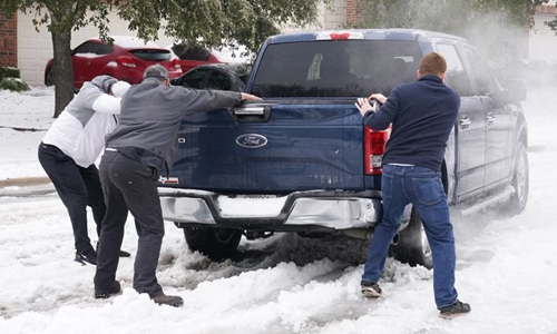 Residents help a pickup driver get out of ice on the road in Round Rock, Texas on Wednesday after a winter storm. Millions of people were still without power. Photo: AFP