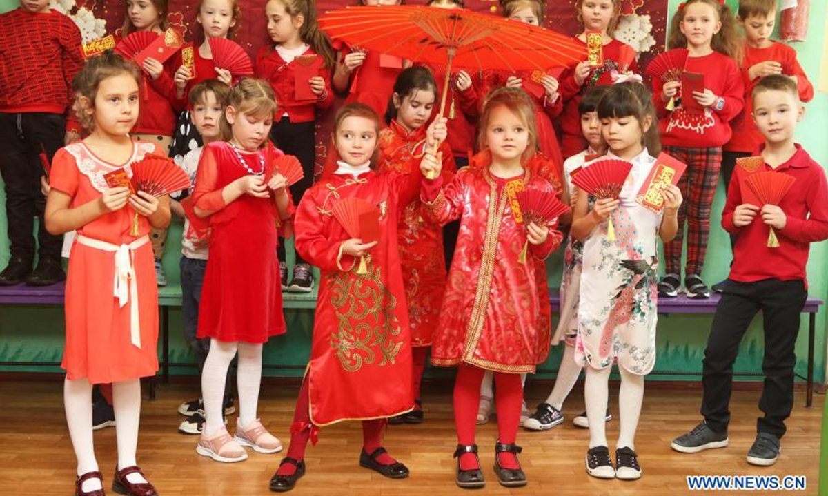 Students in traditional Chinese costumes pose for a photo at Kiev Gymnasium of Oriental Languages No. 1 in Kiev, Ukraine, Feb. 15, 2021. In celebration of the Chinese lunar new year, the school held activities to help students learn about Chinese culture. (Photo by Sergey Starostenko/Xinhua)