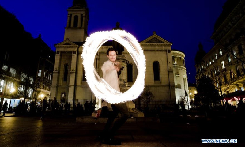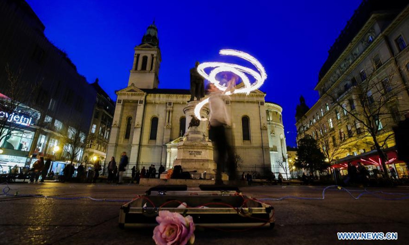 Entertainer, illusionist and magician Borna Vajdic performs at Petar Preradovic Square, in Zagreb, Croatia, Feb. 18 2021.Photo:Xinhua