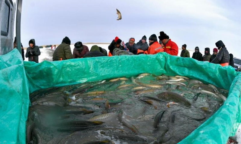 Photo shows fishes caught by fishermen on frozen Ulunggur Lake in Fuhai County, northwest China's Xinjiang Uygur Autonomous Region, Feb. 18, 2021. Every year, fishermen here follow the traditional winter fishing method by putting down a giant net under the ice for fishing on the frozon Ulunggur Lake, one of China's ten largest freshwater lakes. (Photo/China News Service)