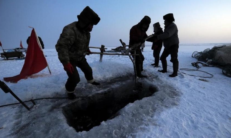 Fishermen chisel a hole on the frozen Ulunggur Lake in Fuhai County, northwest China's Xinjiang Uygur Autonomous Region, Feb. 18, 2021. Every year, fishermen here follow the traditional winter fishing method by putting down a giant net under the ice for fishing on the frozon Ulunggur Lake, one of China's ten largest freshwater lakes. (Photo/China News Service)