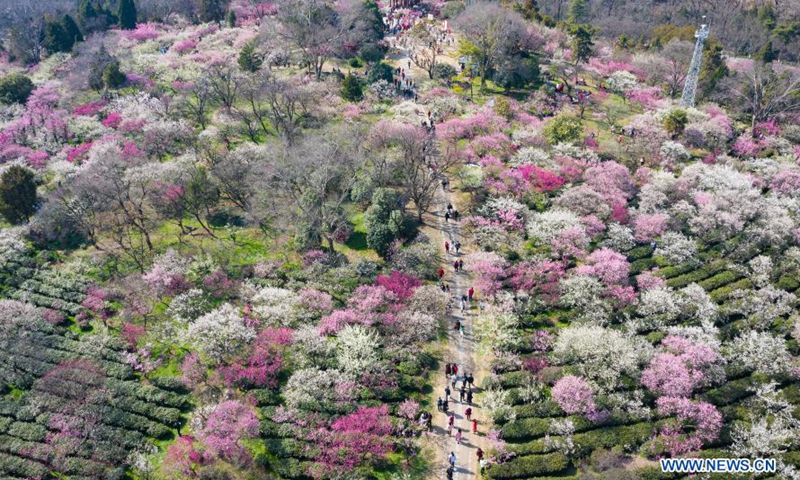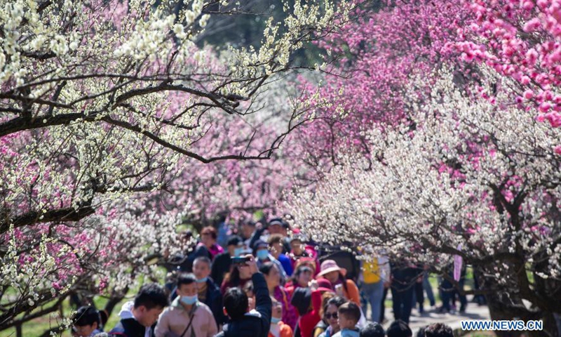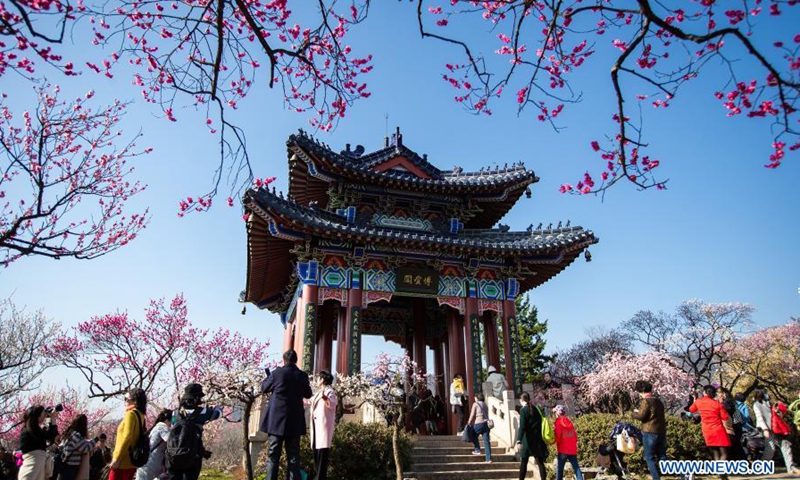 Tourists visit the Meihuashan (Plum Blossom Hill) scenic area in Nanjing, east China's Jiangsu Province, Feb. 19, 2021. A festival featured with plum blossom kicked off here on Friday.Photo:Xinhua