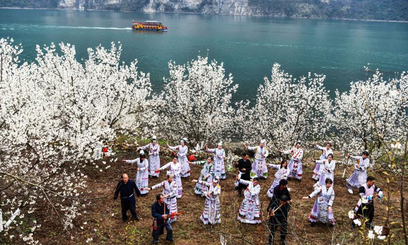 People dance amid cherry blossoms in Huawu Village, Xinren Miao Township, Qianxi County, Bijie City of southwest China's Guizhou Province, Feb. 19, 2021. Huawu Village, with magnificent mountains, wide waters and picturesque scenery, attracts tourists as cherry trees are in blossom in early spring. (Xinhua/Yang Wenbin)
