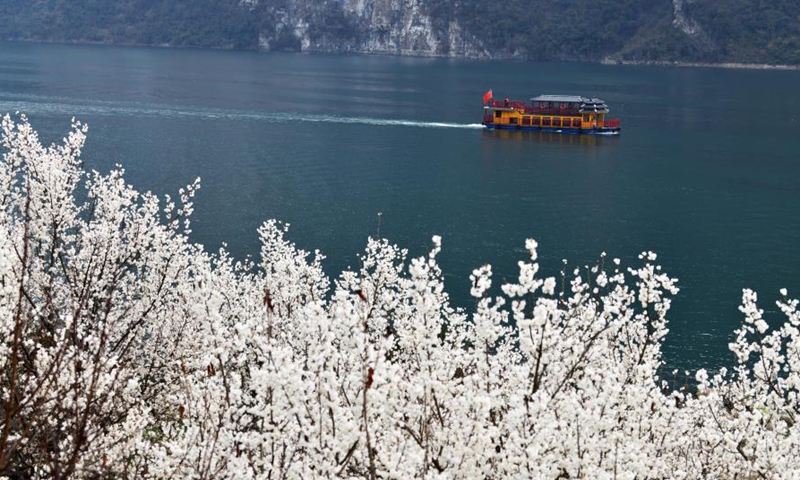 A boat sails at a scenic area in Huawu Village, Xinren Miao Township, Qianxi County, Bijie City of southwest China's Guizhou Province, Feb. 19, 2021. Huawu Village, with magnificent mountains, wide waters and picturesque scenery, attracts tourists as cherry trees are in blossom in early spring. (Xinhua/Yang Wenbin)
