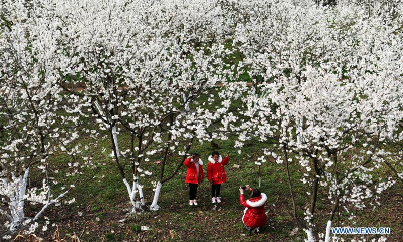 People take photos with cherry blossoms in Huawu Village, Xinren Miao Township, Qianxi County, Bijie City of southwest China's Guizhou Province, Feb. 19, 2021. Huawu Village, with magnificent mountains, wide waters and picturesque scenery, attracts tourists as cherry trees are in blossom in early spring. (Xinhua/Yang Wenbin)