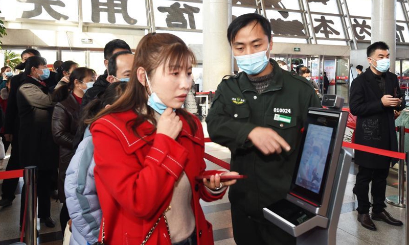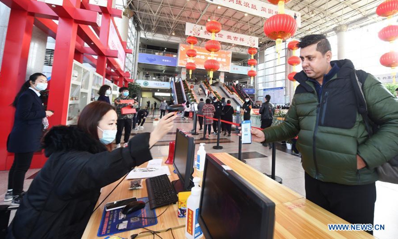 People wait in line to enter the Yiwu International Trade Market in Yiwu City, east China's Zhejiang Province, Feb. 20, 2021. Markets in Yiwu, China's small commodities trade hub, reopened to customers Saturday after the Spring Festival holidays. (Photo by Gong Xianming/Xinhua)