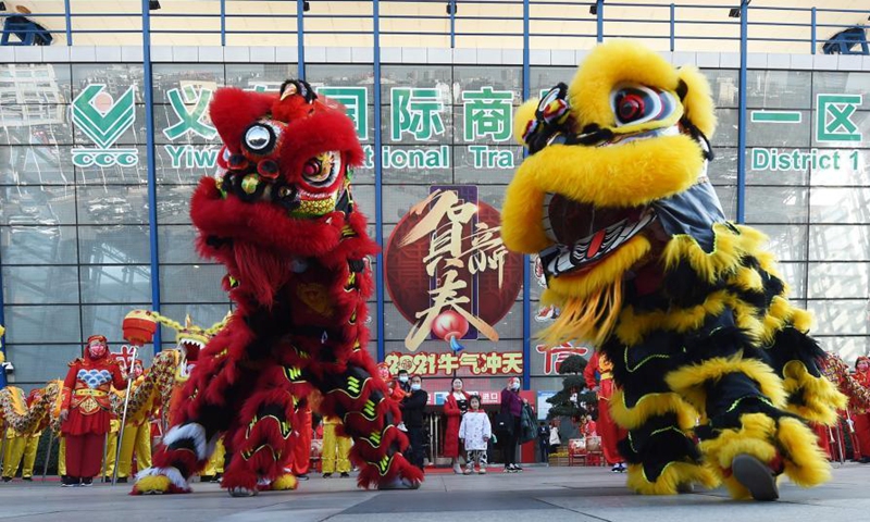 A show is performed to celebrate the reopening of the Yiwu International Trade Market in Yiwu City, east China's Zhejiang Province, Feb. 20, 2021. Markets in Yiwu, China's small commodities trade hub, reopened to customers Saturday after the Spring Festival holidays. (Photo by Gong Xianming/Xinhua)
