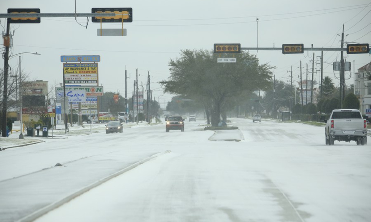 Vehicles move on a snow-capped road in Houston, Texas, the United States, on Feb. 15, 2021. (Photo by Chengyue Lao/Xinhua)