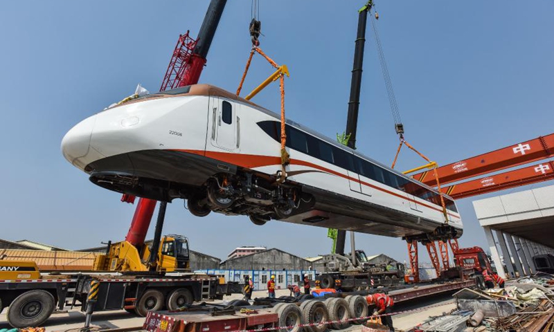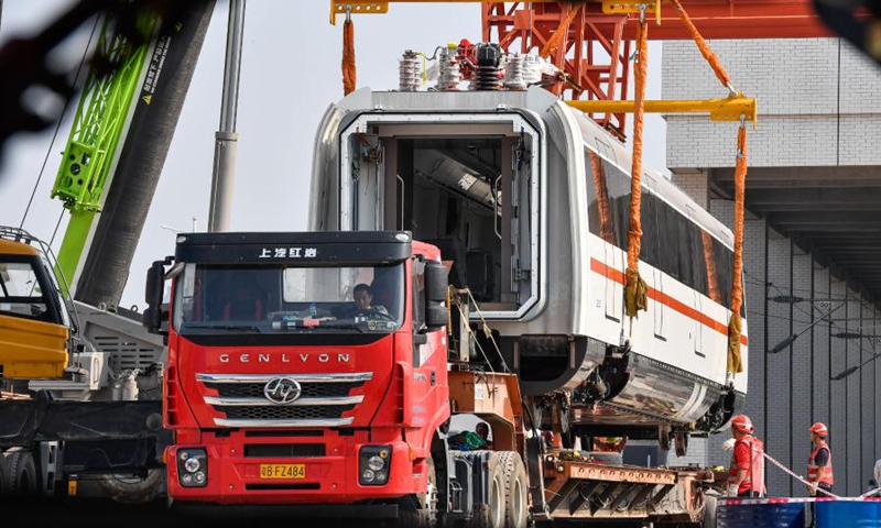 Workers hoist a train section at the Longzhen train depot of Guangzhou Metro Line 18 and Line 22 in Guangzhou, south China's Guangdong Province, Feb. 20, 2021. The first electric train, with a maximum designed speed of 160 km per hour, was put into the designated location at the Longzhen train depot of Guangzhou Metro Line 18 and Line 22 on Saturday. (Photo: Xinhua)