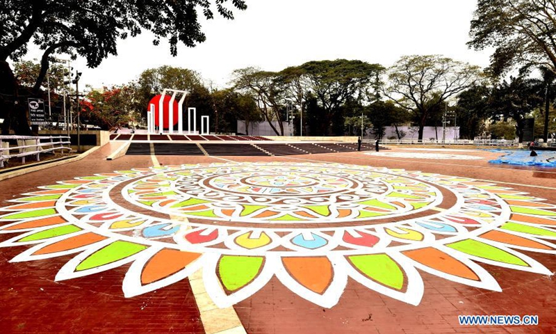 Photo taken on Feb. 20, 2021 shows decorations in front of the language martyrs' memorial monument in Dhaka, Bangladesh. Bangladesh is preparing to celebrate the International Mother Language Day which falls on Feb. 21. The United Nations Educational, Scientific and Cultural Organization (UNESCO) declared Feb. 21 as the International Mother Language Day. (Photo: Xinhua)