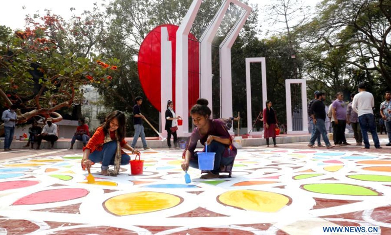 Artists paint in front of the language martyrs' memorial monument in Dhaka, Bangladesh, on Feb. 20, 2021. Bangladesh is preparing to celebrate the International Mother Language Day which falls on Feb. 21. The United Nations Educational, Scientific and Cultural Organization (UNESCO) declared Feb. 21 as the International Mother Language Day.(Photo: Xinhua)