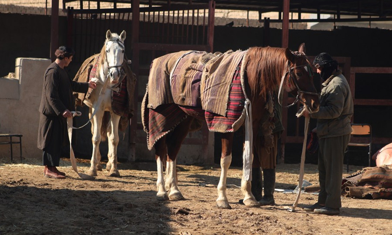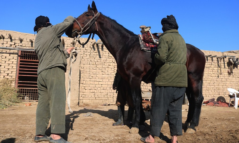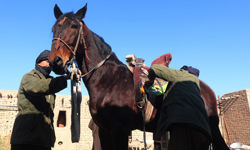 Afghan men prepare a horse for contesting at a horse breeding center in Shiberghan, capital of Jawzjan province, Afghanistan, Jan. 26, 2021.(Photo: Xinhua)
