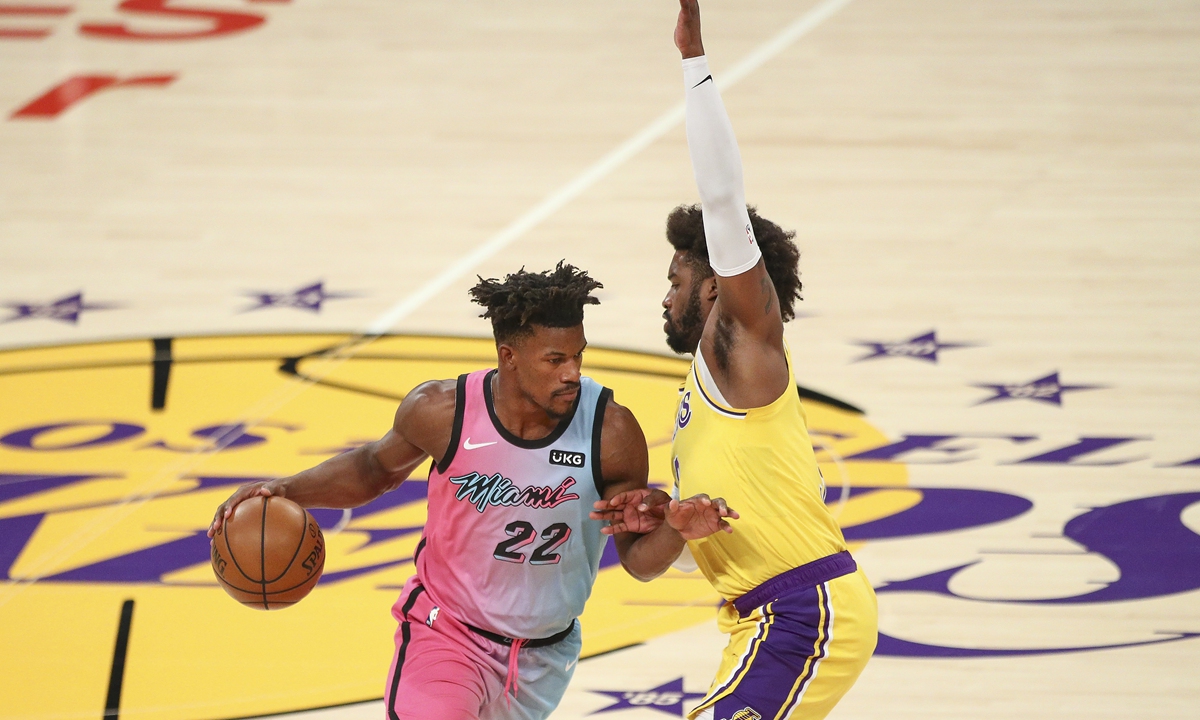 Jimmy Butler of the Miami Heat handles the ball defended by Wesley Matthews of the Los Angeles Lakers on Saturday in Los Angeles, California. Photo: VCG