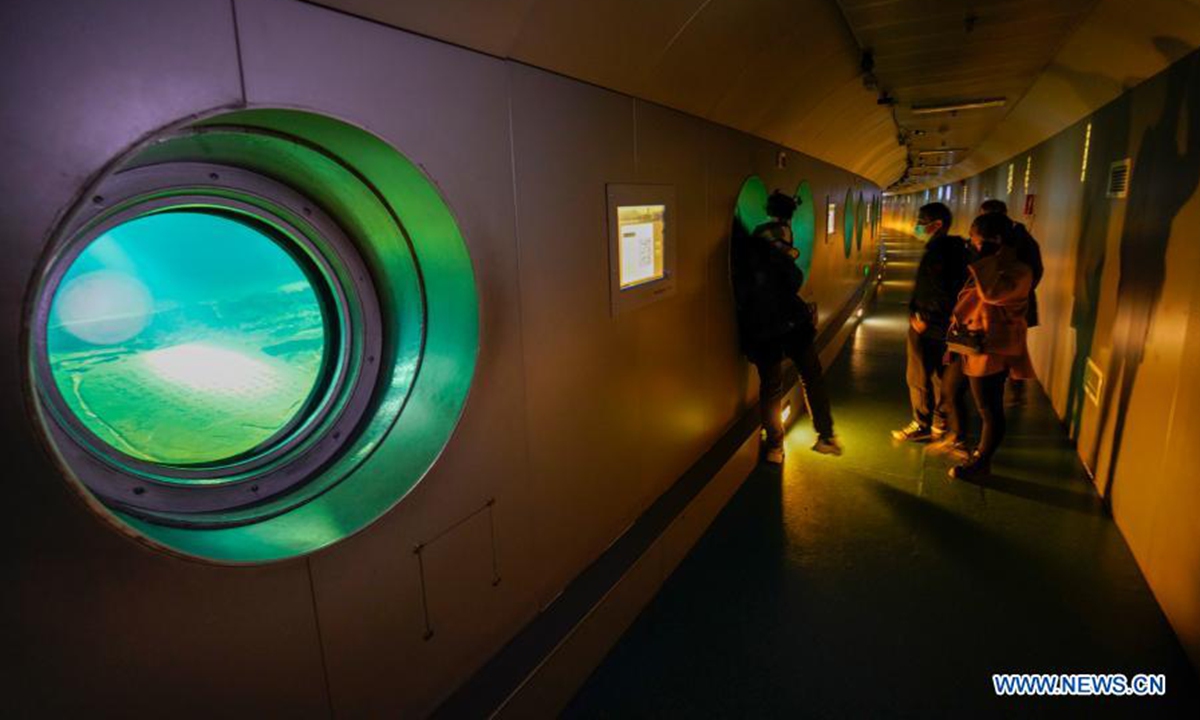 People visit Baiheliang Museum, China's first underwater museum built about 40 meters below surface in the upper reaches of the Yangtze River off the coast of Fuling City, southwest China's Chongqing Municipality, Feb. 21, 2021. (Xinhua/Liu Chan)