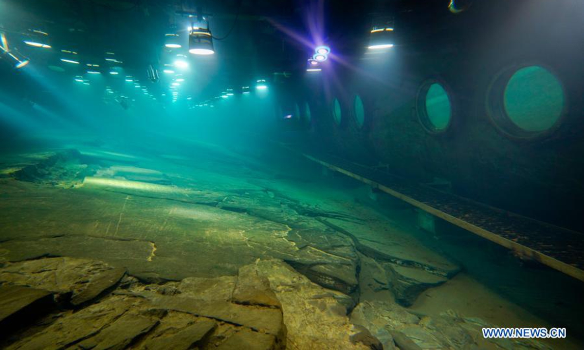 Photo taken on Feb. 21, 2021 shows the protected reef created about 1,200 years ago to measure the changes in water levels at Baiheliang Museum, China's first underwater museum built about 40 meters below surface in the upper reaches of the Yangtze River off the coast of Fuling City, southwest China's Chongqing Municipality. (Xinhua/Liu Chan)