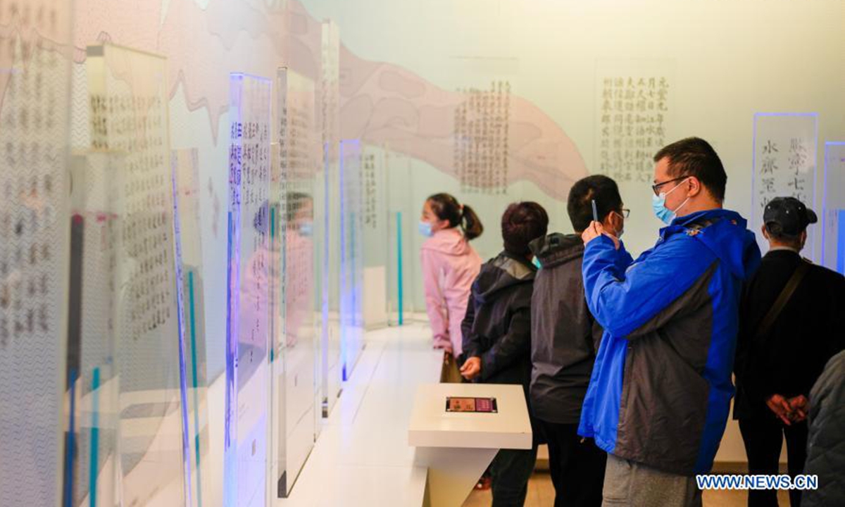 People visit an on-land exhibition room of Baiheliang Museum, China's first underwater museum built about 40 meters below surface in the upper reaches of the Yangtze River off the coast of Fuling City, southwest China's Chongqing Municipality, Feb. 21, 2021. (Xinhua/Liu Chan)