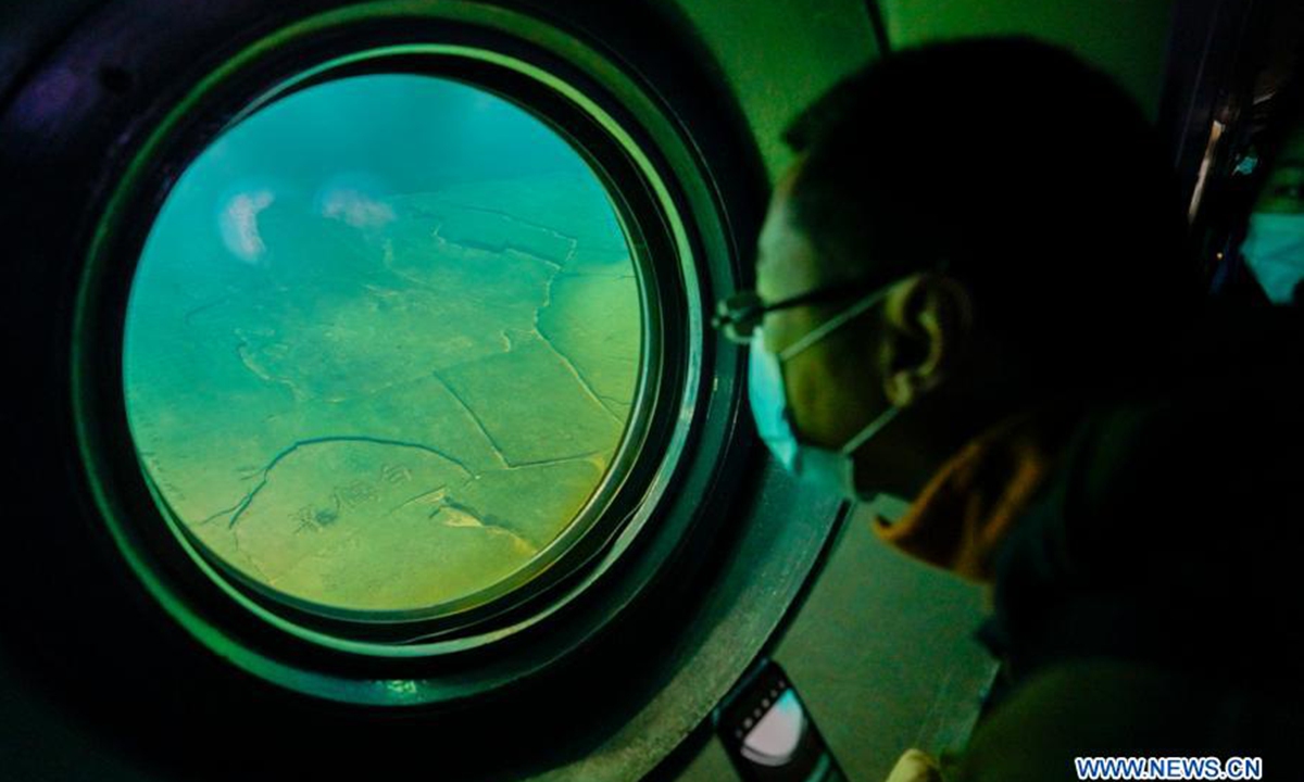 A visitor looks out from a window at Baiheliang Museum, China's first underwater museum built about 40 meters below surface in the upper reaches of the Yangtze River off the coast of Fuling City, southwest China's Chongqing Municipality, Feb. 21, 2021. (Xinhua/Liu Chan)