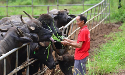 A villager feeds a herd of cattle at Gulantun Village in Daliang Township of Rongan County, south China's Guangxi Zhuang Autonomous Region. (Xinhua/Huang Xiaobang)
