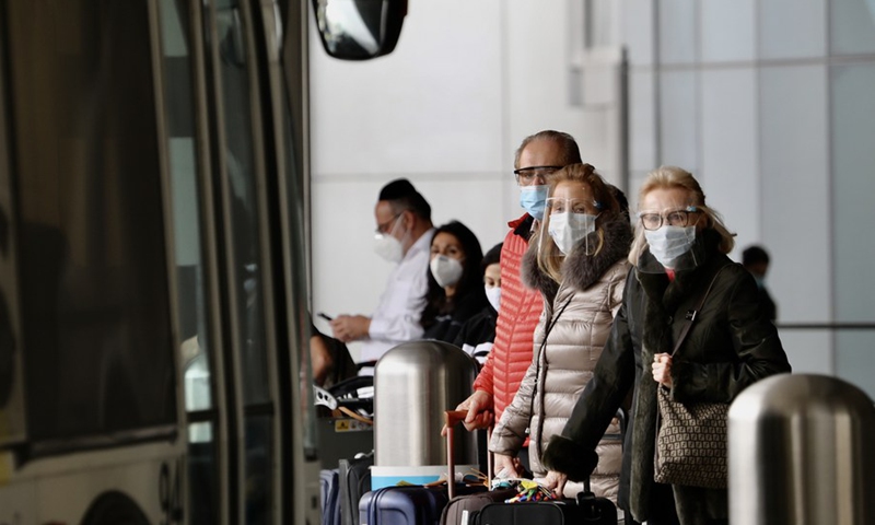 Travelers with face masks wait for public transportation services at the International Airport in Los Angeles, California, the United States, on Feb. 1, 2021.(Photo: Xinhua)