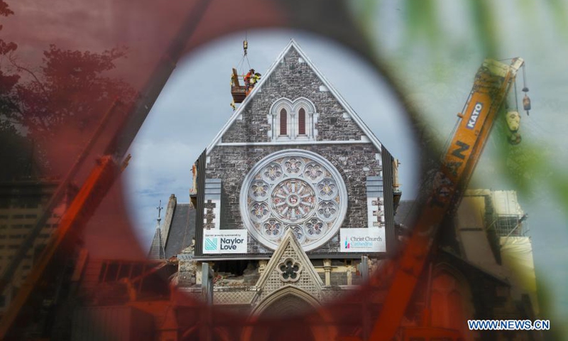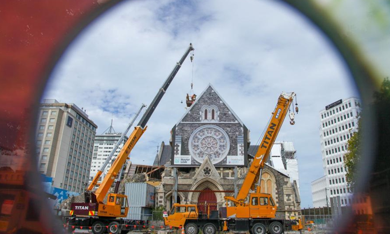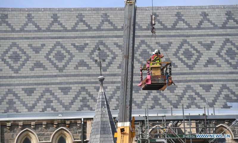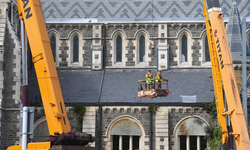 Workers operate at the site of the Christchurch Cathedral reinstatement project in Christchurch, New Zealand, Feb. 22, 2021. Christchurch Cathedral, a landmark in the southern New Zealand city of Christchurch, was seriously damaged during an earthquake that jolted the city in late December 2011. Rebuilding efforts have been on for almost ten years before the majority of the structure is restored. (Xinhua/Guo Lei)