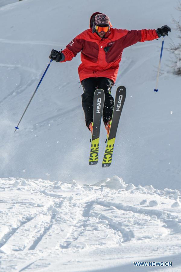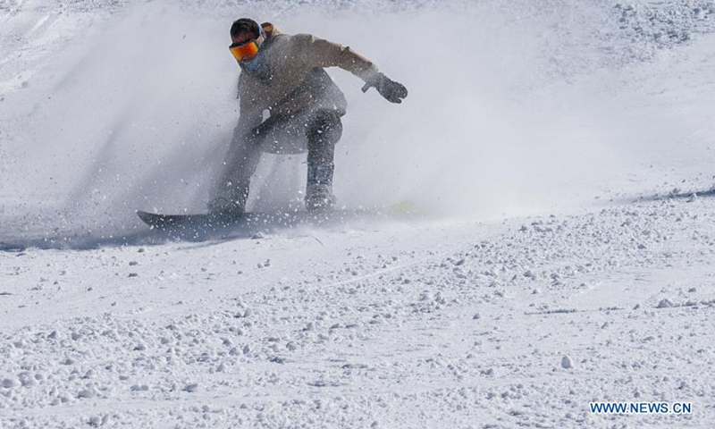 A man practices skiing at Mount Hermon ski resort on the first day of its opening this year in the Israeli-occupied Golan Heights, on Feb. 21, 2021. (Ayal Margolin/JINI via Xinhua)