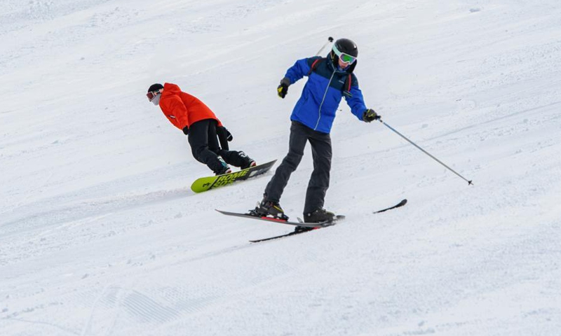 People practice skiing at Mount Hermon ski resort on the first day of its opening this year in the Israeli-occupied Golan Heights, on Feb. 21, 2021. (Ayal Margolin/JINI via Xinhua)