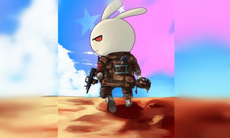 In the picture, a rabbit wearing battle fatigues and carrying a Type-95 rifle walks forward, flying China's national flag above its head. It looks ready to protect China and fight enemies. The rabbit is a household name to the Chinese public; numerous netizens said they also use similar
