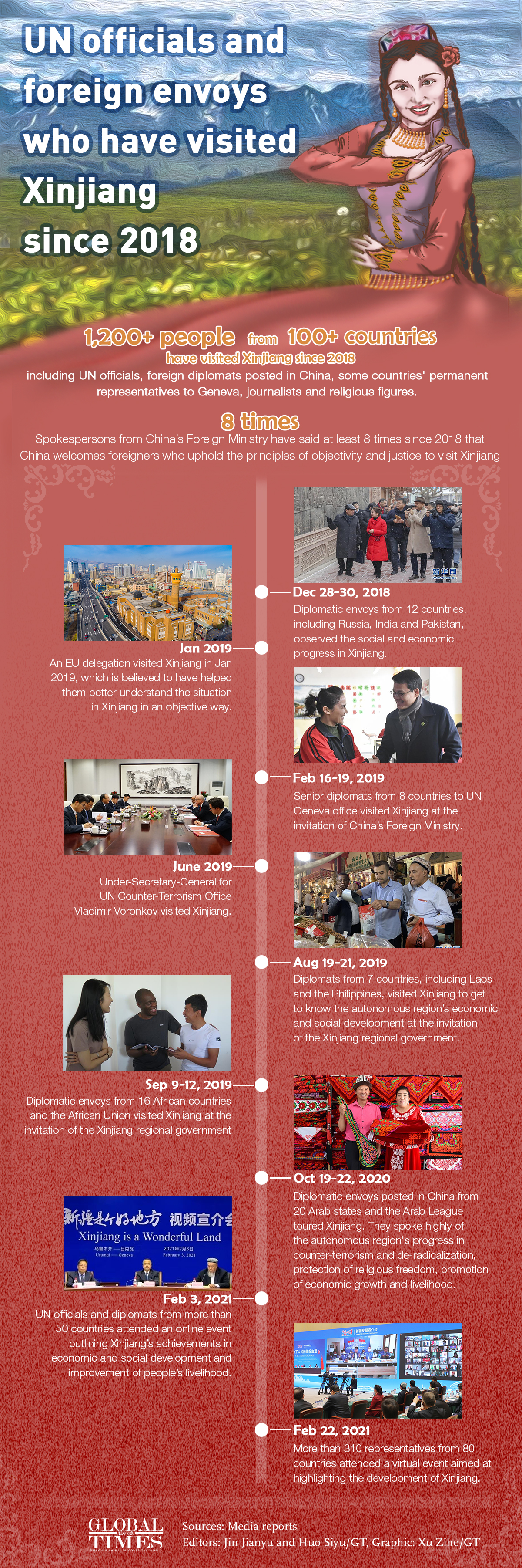 1,200+ people from over 100 countries have visited Xinjiang since 2018, including UN officials & foreign diplomats posted in China. China welcomes foreign friends who uphold the principles of objectivity & justice to visit Xinjiang to see the economic & social development there. Editors: Jin Jianyu and Huo Siyu/GT Graphic: Xu Zihe/GT