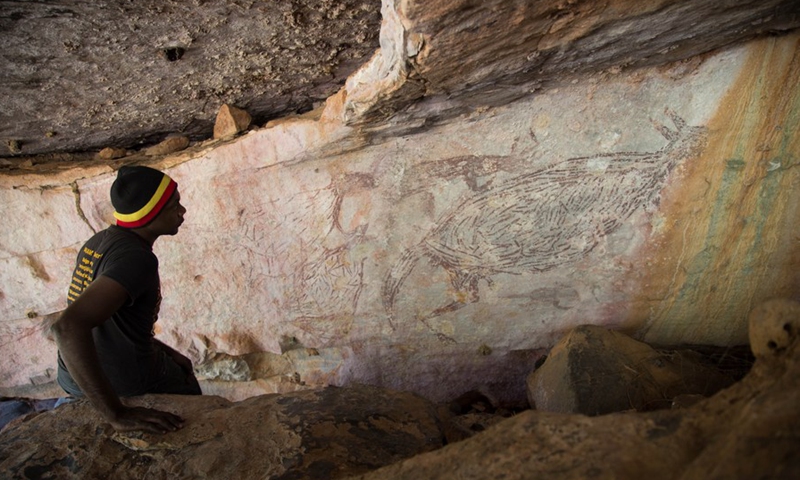 File photo taken on July 15, 2016 shows an aborigine looking at a rock painting of kangaroo in Kimberley region, Australia.(Photo: Xinhua)
