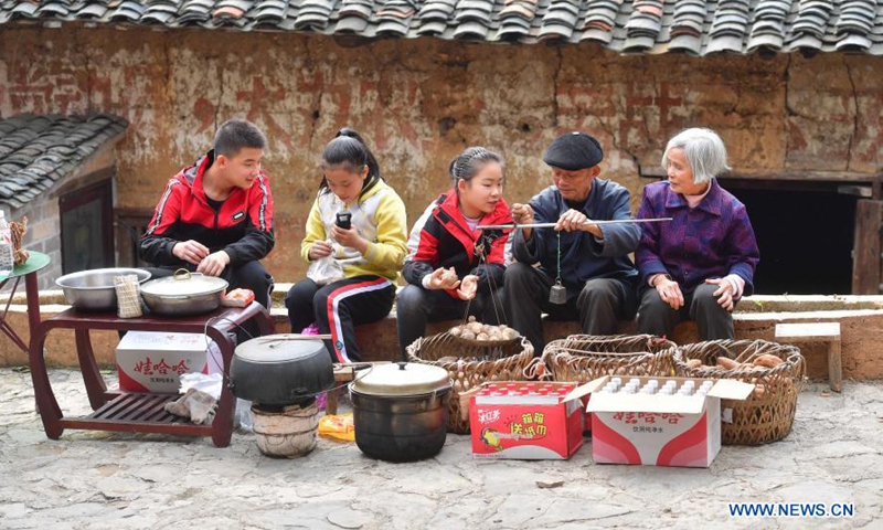 Children help families to sell local specialties in Tongban hamlet, Yajiao Village of Rong'an County, south China's Guangxi Zhuang Autonomous Region, Feb. 15, 2021.Photo:Xinhua