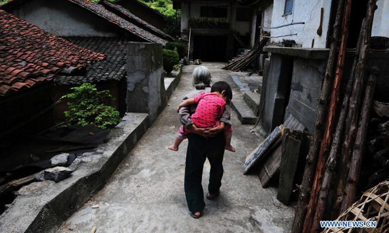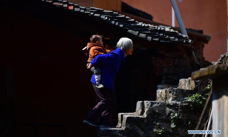 An elder carrying a child on her back walks out of home in Tongban hamlet, Yajiao Village of Rong'an County, south China's Guangxi Zhuang Autonomous Region, Feb. 17, 2021.Photo:Xinhua