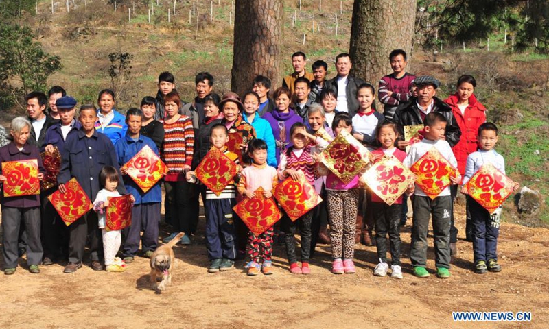 Girls enjoy flowers with their grandpa in Tongban hamlet, Yajiao Village of Rong'an County, south China's Guangxi Zhuang Autonomous Region, Feb. 26, 2017.Photo:Xinhua