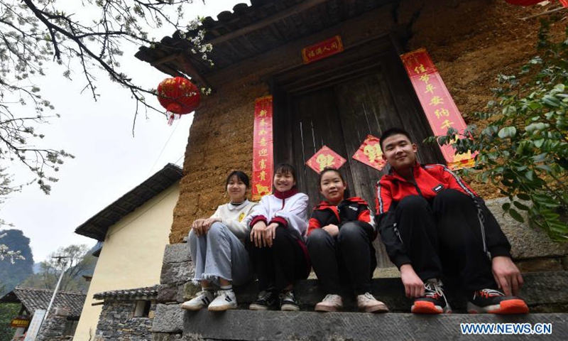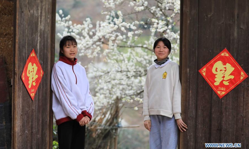 Girls pose for a photo in front of their house in Tongban hamlet, Yajiao Village of Rong'an County, south China's Guangxi Zhuang Autonomous Region, Feb. 15, 2021.Photo:Xinhua