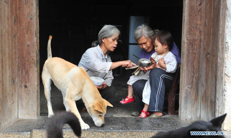 A child has lunch with grandma (L) in Tongban hamlet, Yajiao Village of Rong'an County, south China's Guangxi Zhuang Autonomous Region, Oct. 21, 2012.Photo:Xinhua