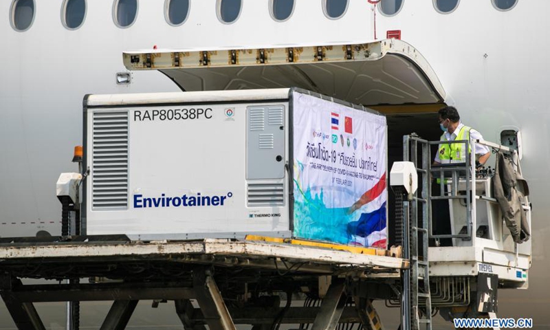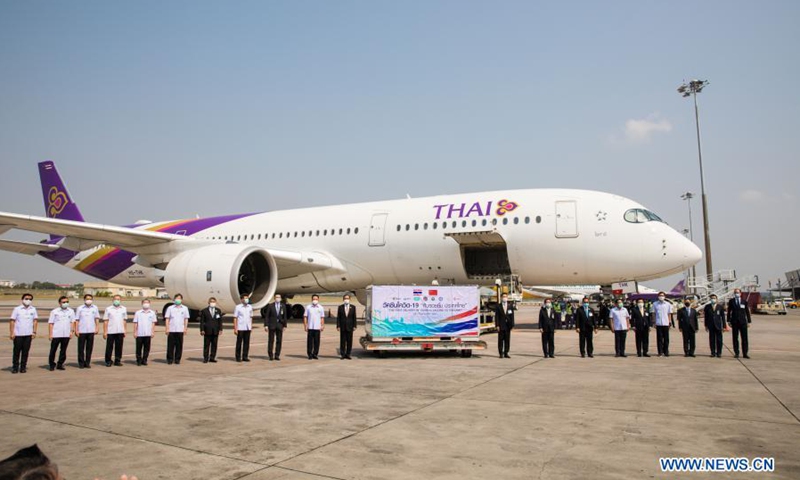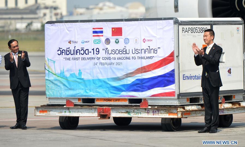 The first batch of COVID-19 vaccines arrive at Suvarnabhumi Airport in Bangkok, Thailand, Feb. 24, 2021. The first batch of COVID-19 vaccines that Thailand ordered from China's Sinovac Biotech arrived in the capital Bangkok Wednesday, putting the country on track to kickstart its national inoculation program.(Photo: Xinhua)