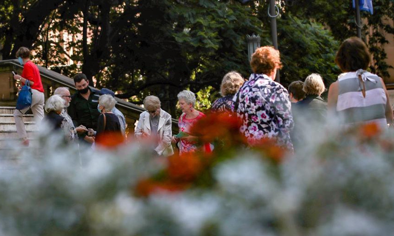 People wait for a concert outside the Town Hall in Sydney, Australia, on Feb. 26, 2021. Restrictions in the Australian state of New South Wales (NSW) will further ease from Friday as vaccination rolled out and "no local case" status continued. (Xinhua/Bai Xuefei)
