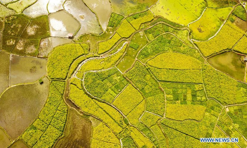 Aerial photo taken on Feb. 24, 2021 shows the spring scenery near Guandong Township of Congjiang County, southwest China's Guizhou Province. (Xinhua/Yang Wenbin)