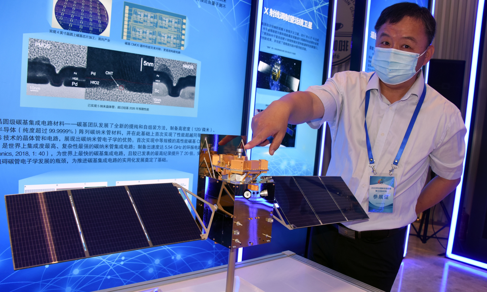 A researcher introduces the model of China? Hard X-ray Modulation Telescope during a science event in Beijing, China, in August 2020. Photo: IC