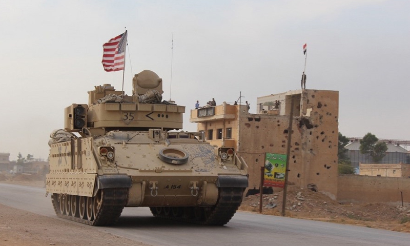 A U.S. military vehicle is seen passing through the Tal Tamr area in the countryside of Hasakah Province in northeastern Syria on Nov. 14, 2019. (Xinhua file photo)