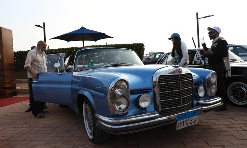 Visitors look at a car during the Classic Mercedes-Benz Cars Show in Cairo, Egypt, on Feb. 26, 2021. (Xinhua/Ahmed Gomaa)
