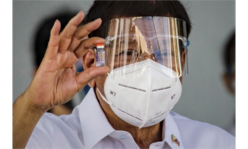 Alfonso Famaran (front left), director of the Dr Jose Rodrigues memorial hospital, receives the Sinovac COVID-19 vaccine during the first phase of vaccinations for health workers in Manila, the Philippines on Monday. Photo: AFP