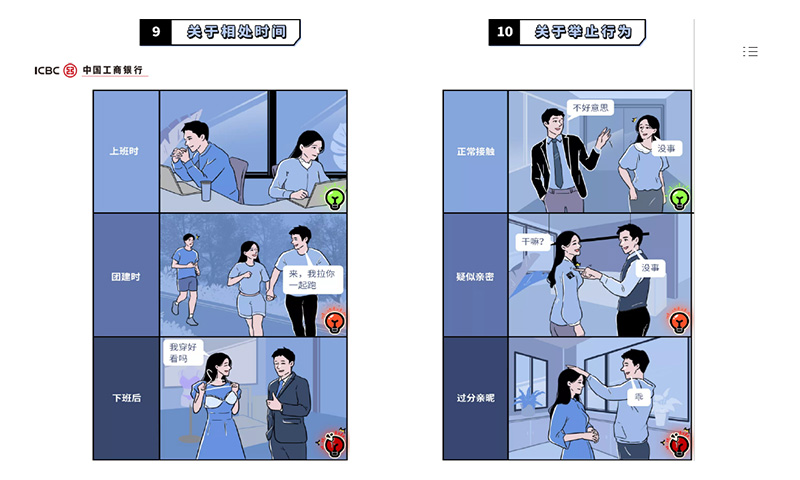 The guide outlines 10 principles when handling workplace communication between members of the opposite sex involving scenarios such as meals, presenting gifts, and even the use of emojis during online chats. Photo: screenshot of the ICBC guide
