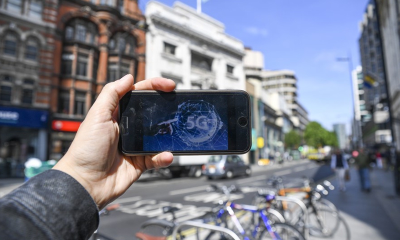 Photo taken on May 30, 2019 shows a 5G network logo on the screen of a mobile phone in London, Britain.(Photo:Xinhua)