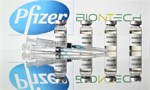 An illustration shows vials of a COVID-19 vaccine and syringes with the logos of US pharmaceutical company Pfizer and German partner BioNTech. Photo: AFP