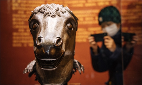 Visitors take pictures of the bronze horse zodiac head that was stolen by invading forces when British and French troops razed the Old Summer Palace in 1860. The statue finally returned to its home, Yuanmingyuan, or the Old Summer Palace. Photo: Li Hao/GT