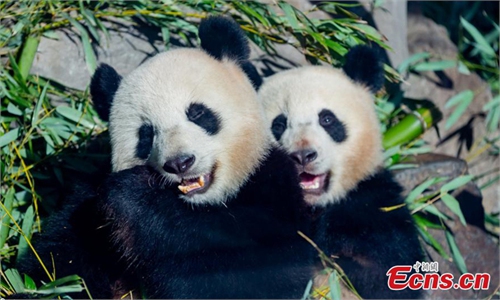 Two giant pandas are pictured at Chengdu Research Base of Giant Panda Breeding during a theme event marking International Panda Day in Chengdu, southwest China's Sichuan Province, Oct. 27, 2020. (Photo by Chen Juwei/Xinhua)